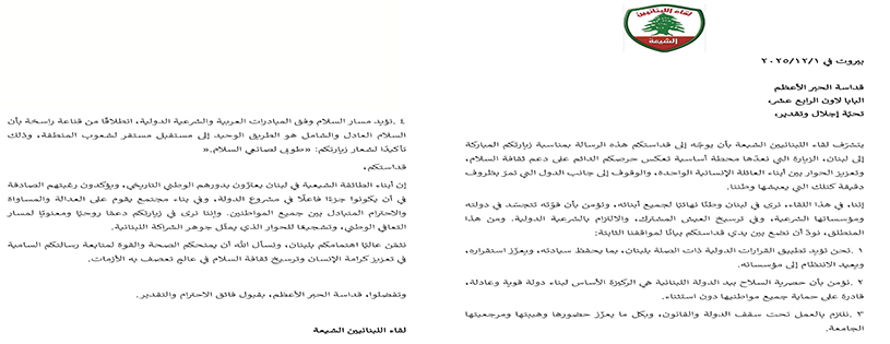 يتشرّف لقاء اللبنانيين الشيعة بأن يوجّه إلى قداستكم هذه الرسالة بمناسبة زيارتكم المباركة إلى لبنان، الزيارة التي نعدّها محطة أساسية تعكس حرصكم الدائم على دعم ثقافة السلام، وتعزيز الحوار بين أبناء العائلة الإنسانية الواحدة، والوقوف إلى جانب الدول التي تمرّ بظروف دقيقة كتلك التي يعيشها وطننا.